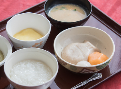 噛むこと、飲み込むことが難しい方にも、視覚的に美味しく、安心してお食事を召し上がっていただけるようオーダーメイドの「形態食」をご用意。その日の体調に合わせた形態食を5段階からお選びいただくことが可能です。