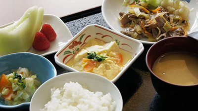 お身体の状態やその日の体調に合わせて、食べやすい食事形態への対応や、調理法の工夫をしています。また、症状に合わせて糖尿病食、減塩食、腎臓病食など医師の指示のもと個別対応もいたします。