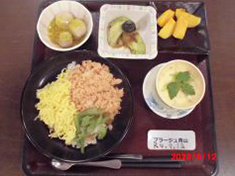 食堂は開放感のある吹き抜け構造で、ステンドグラスからは彩り豊かな光が差し込みます。栄養バランスはもちろん、季節を感じる工夫をこらした食事をご提供。
