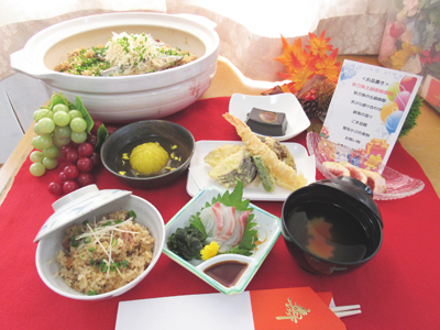 季節の食材を盛り込み、変化に富んだお食事をご用意しております。塩分調整、食事形態など、お体に合った食事を提供いたします。食の向上にも力を入れており、普通食以外に希望者にはパンをご提供。月2回の行事食もあり食事への楽しみも広がっています。